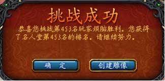 8、另外选择一名实力相当的玩家进行挑战吧。经过一番厮杀,您终于获得了胜利,挑战成功。点击“创建雕像”就可以在名人堂中建立起属于自己的雕像了。