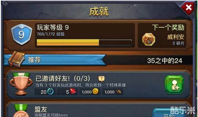 解锁成就可以获得宝石与经验值,经验只可以用来提升玩家等级,玩家会在升级时获得英雄碎片的奖励。
