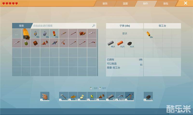 制作子弹所需材料:X1铁锭、x1铜锭、x1火药 (需要钳工台)