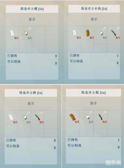 炼金术士长袍:布X1、皮革X2、裁缝工具箱X1、小刀X1;