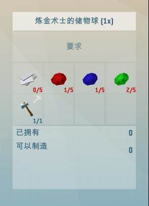 炼金术士的储物球:钢板X5、红色颜料X5、蓝色颜料X5、绿色颜料X5、锤子X1;