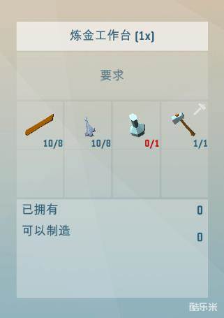 炼金工作台:木板X8、铁锭X8、玻璃烧瓶X1、锤子X1;