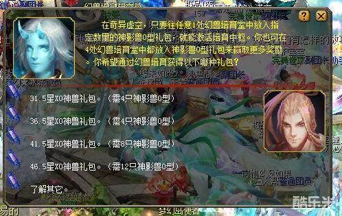 昨日先锋区又进行了一次更新,这次更新带来了一个新玩法“奇异虚空”。在奇异虚空内,只要往任意1处幻兽培育室中放入奇异兽O型礼包或神影兽O型礼包,就能激活幻兽培育中枢,从而有机会培育出一定数量的指定星级奇异兽XO型或神影兽XO型!