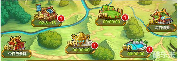 这是日常物品的领取地是宝石碎片的第二来源地,包括:参拜、休息、炼丹、狩猎、垂钓、请安,根据VIP等级可翻倍获得。