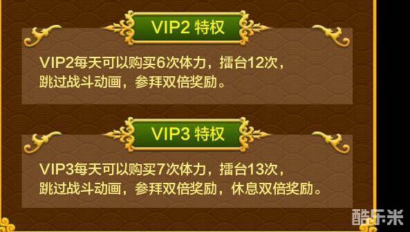 答:有机会多购买体力跟打擂台,VIP3以上参拜休息双倍经验,VIP7招募时双倍获得相对卡片。
