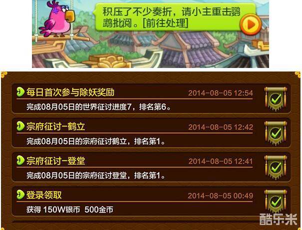 2.除妖娃娃: 每天11:00开始除妖,每天可以打10次妖怪,第一次是免费的后面是10金币一次,根据排名高低掉落1至4星装备打开会得到什么看人品。