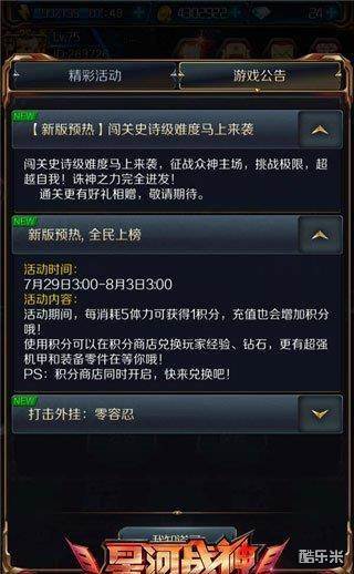 今天小神要对大家说的就这么多。版本虽然要更新了,但是我们《星河战神》的宗旨还是不会变的,相信只要大家和以前一样每天都照顾到游戏,战力的升值是不会亏待大家的。