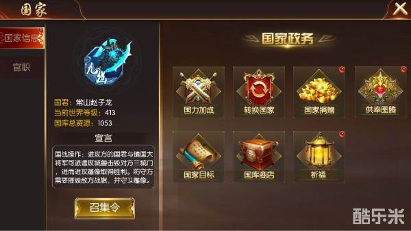 游戏中存在着两个独立的国家,分别为赤炎和九幽,每个国家会有一名国君来进行管理,指挥国战、布置战术;操纵攻城兽、奇袭城门;鼓舞战旗、助理攻城拔寨。