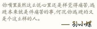 内敛、敏感、低调。忧郁的伤痕下,有一双温柔的眼睛。早年贫困,后被高寄萍收养,培养为杀手。老伯事件后,与小蝶退隐山林。