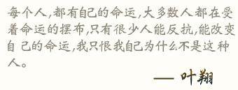 被磨砺地坚韧并且成熟,立誓再不杀一人,逐步发现了内心的平静。年少被高寄萍收养,培养为杀手。在一次刺杀行动中,被孙玉伯手下的杀手韩棠挫败,丧失了所有自信,从此自甘堕落。律香川救了这个曾经出色的杀手,希望他能为其所用。然而事败之后,诈死逃脱的律香川要杀死叶翔灭口,幸好关键时刻叶翔武功尽复,律香川只如惊弓之鸟,狼狈逃脱。