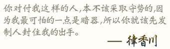 表面忠厚,内心则充满黑暗,城府非常之深,阴狠狡诈,遇事不择手段。被孙玉伯收养,后成为老伯的得力助手,但他野心勃勃,不仅侮辱了孙玉伯的女儿小蝶,更挑起孙玉伯与万鹏王之间的战争,并趁机叛乱,最终功败垂成。律香川狡猾地用诈死之计暂时得瞒过了老伯。老伯却以为,此人已经不足为患。当务之急,乃是全力对付万鹏王。可是,律香川的阴谋,才刚刚露出一丝端倪。他的野心远不仅是老伯的道义盟,而是更大,更处心积虑。