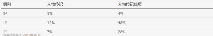 祈福得人物传记的概率为20%,祈福得人物传记残页概率为80%,合计100%。不同等级的人物传记和残页总概率分布如下: