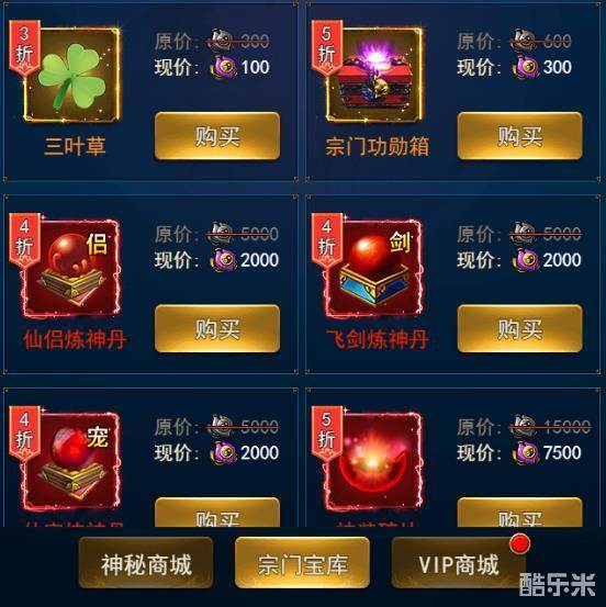 这个就是凡人飞仙传的宗门宝库玩法的界面了,可以看到宗门商店中有着三叶草、功勋箱、以及各种炼神丹还有神装碎片。购买时需要消耗宗门勋章。喜欢的东西想换就去换吧。