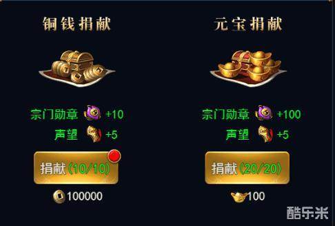 宗门勋章的来源是铜钱捐献和元宝捐献两种。消耗的与获得的勋章也不太一样。