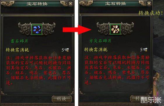 2.将你所需要转换的宝石拖入界面中。系统将根据宝石的级别给出需要消耗的游戏币。宝石等级越高,所花费的金钱也越多。点击“转换”即可随机获得同等级的宝石。需要说明的是,龙石、水银石、润石、顽石、鸣石、紫电石、厚石、猫眼石无法转换。无论在转换前宝石是否绑定,在转换后都会变成绑定宝石。
