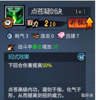 凝剑诀是玩家游戏早期就能够获得的内功招式,初始的属性看上去并不特别强——白色的初始品质、战斗中提升10的暴击,提升50%下一回合招式的伤害,所以在配招的时候要确保凝剑诀后面跟着一个高迅捷的招式,放在一些高迅捷高伤害招式之前经常能够秒杀敌人,3格的耗气不算高,能够尽量保证下一招还有真气释放,7点迅捷则保证了凝剑诀能够尽快出手。