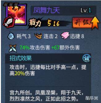 凤舞九天是玩家能够获得的第一个紫色招式,凤舞九天特效带来的伤害加成还会随着迅捷的增高而大幅提升,下面就跟小编一起来了解下吧!