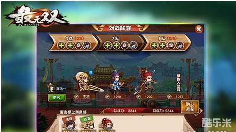 参战玩家需提前设置好一套最多12位武将的阵容,阵容中包含3个小队,每个小队由3名武将和1名援护组成。大于等于20级的武将才可以上阵。阵容可以为空。对战时,3个小队分别参与3场战斗,最后三局两胜判定对战输赢。单局战斗时间上限1分钟,超时未决出胜负则剩余血量百分比和高的一方胜出。