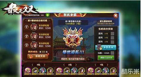 群英争霸玩法在玩家队伍等级达到50级时开启,群英争霸以赛季模式开放,每赛季会持续2周自动算,之后新赛季开启。赛季中共分31个段位,随着玩家胜利场数越多,段位将会提升,奖励也越丰厚。玩家每次进入战斗时系统都会为你匹配一位段位相同的玩家进行比赛,每次对战为三局两胜制。战胜后,玩家可得到一定数量的积分,以及争霸币,若对战失败,玩家得不到积分,但会获得到少量的争霸币。累积一定的积分可以晋升段位,每次段位晋升后,玩家可以立刻获取一笔奖励,奖励与段位等级挂钩哦。