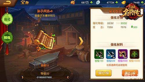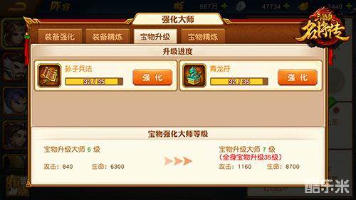 2. 宝物分为两个部件,兵书强化增加攻击,兵符强化增加生命。