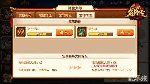 3. 宝物可精炼的等级也有上限,该上限值同样也与主角等级有关,精炼等级上限=主角等级*0.12(向下取整)。比如主公等级54级,宝物最高可精炼到6级。