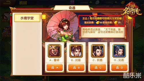 游历玩法中的“水镜学堂”奇遇,完成答题即可轻松获得元宝奖励。