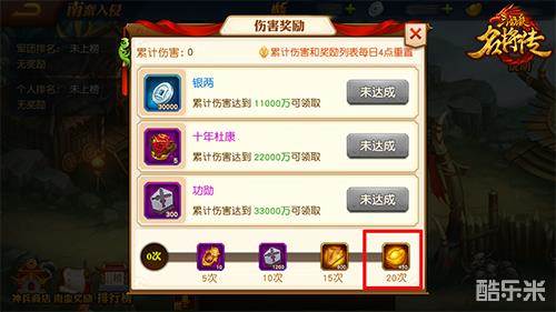 每天完成南蛮入侵伤害奖励领取20次,可获得元宝奖励。