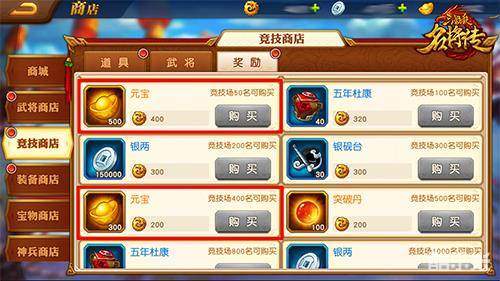 竞技场商店、装备商店达成指定目标即可兑换元宝奖励,只能获得一次。