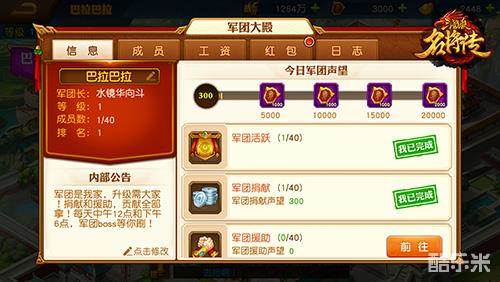 【军团大殿】:可查看军团成员信息、发放和领取军团红包、查看军团成员活跃度和军团日志、退出军团。