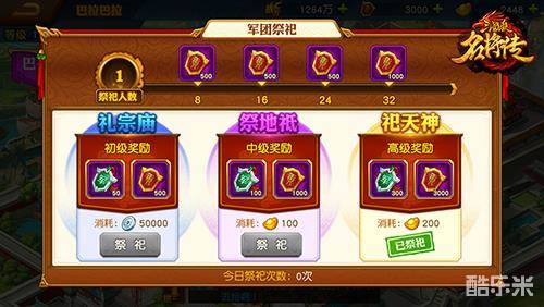 【军团祭祀】:每日祭祀、领取祭祀宝箱奖励。