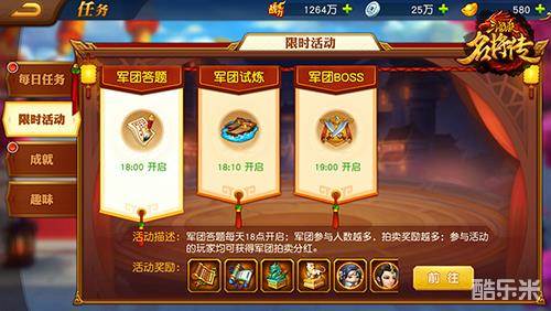 1. 开服第二天开启,通过“任务-限时活动-军团答题”参与,每天18:00固定时间开启答题。