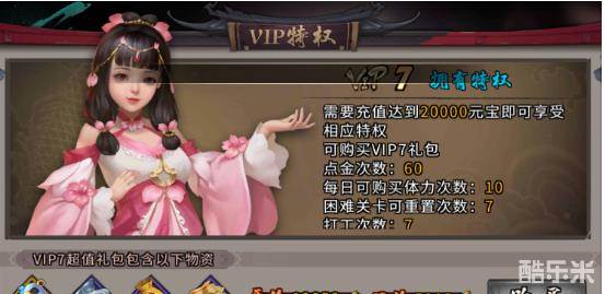 充值20000元宝可以享受VIP1特权,那么VIP7特权有哪些呢,VIP7礼包是什么呢。下面和小编一起来了解一下吧。