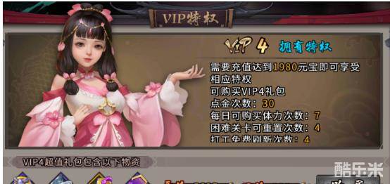 充值1980元宝可以享受VIP4特权,那么VIP4特权有哪些呢,VIP4礼包是什么呢。下面和小编一起来了解一下吧。
