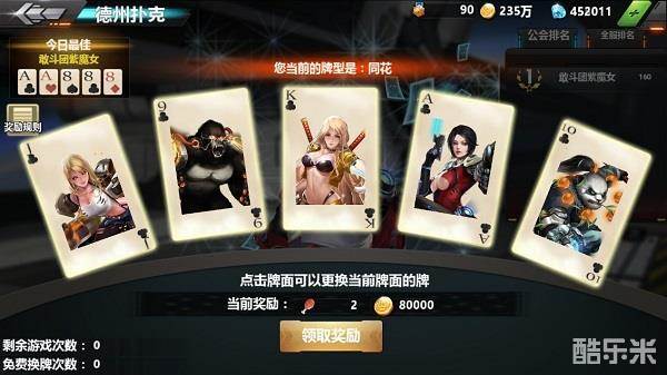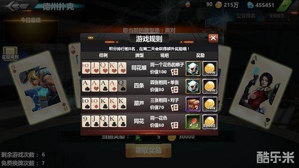 虽然名为“赌场”但是与赌博可是一点都不沾边的,并不需要你们押注猜大小之类的,只需要根据手中的牌来领取对应的奖励即可,但是若是只是这样生活的乐趣也太少,所以小金苦思冥想决定做一种德州扑克牌型的游戏,根据得到的牌在德州扑克规则中的大小来对应不同的奖励,同时呢还开放换牌次数给各位,那些特别想要奖励就可以试试啦!