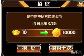 游戏中点击金币图标附件+号按钮,可开启招财界面,用元宝兑换大量的金币。