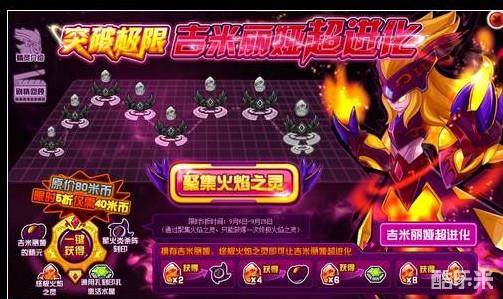 一段动画过后,出现活动界面,获得超进化道具的方法有两种,都需要米币。其中,聚集火焰之灵不虚全部点燃才能获得超进化道具。因此,对于想获得吉米丽娅超进化的赛尔推荐【一键获得】,不会那么麻烦。