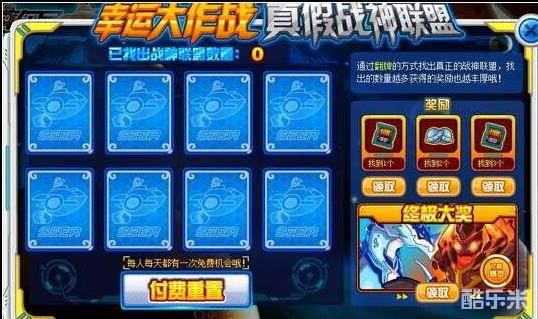 进入幸运大作战活动界面。活动规则很简单,8张卡牌后面藏着真战神联盟和假战神联盟。找到1只真战神联盟成员可以领取1W经验,找到2只真战神联盟成员可以领取赛尔豆,找到3个真战神联盟可以领取3W经验。找到全部的真战神联盟,可点击右下角终极大奖,选择里面的奖励领取了。