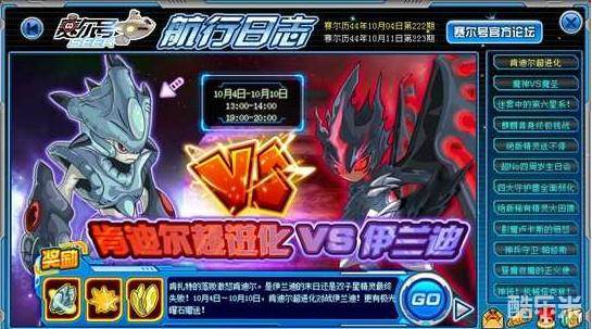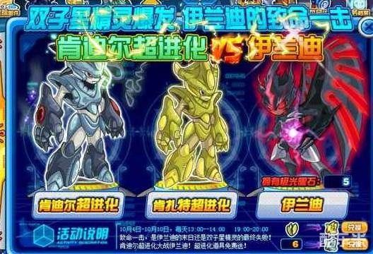 参加赛尔号活动可以获得宿命之光碎片,碎片可兑换肯迪尔或肯扎特的超进化道具,同时有机会得到极光耀石,来兑换兑换伊兰迪的精元哦。超进化大战再次爆发!