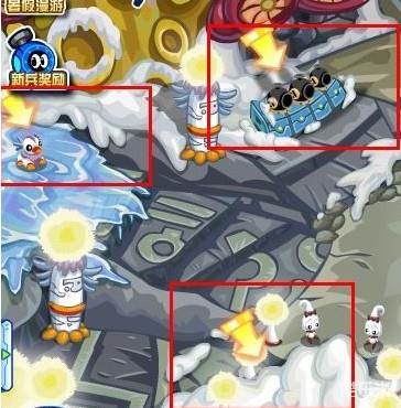 图中所示的三个位置就是斯诺星的三个小游戏:勇闯冰雪关、赛尔套圈大赛、米鲁雪地疾走。
