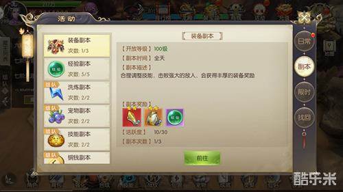 每日的【经验副本】、【铜钱副本】、【宠物副本】、【技能副本】、【洗炼副本】等都会掉落大量的材料,使用材料即可获得大量的战斗力。