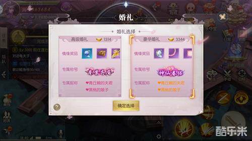 婚礼有高级婚礼和豪华婚礼,分别需要1314和3344的元宝,并可以要求朋友前来参加。在婚礼中的小伙伴都可以获得大量的经验和少量的绑元奖励。