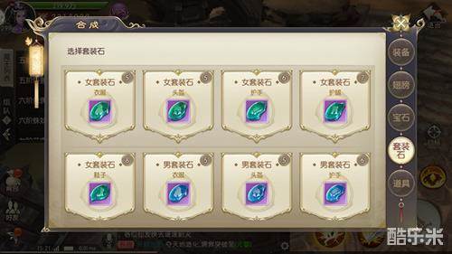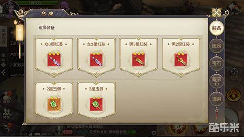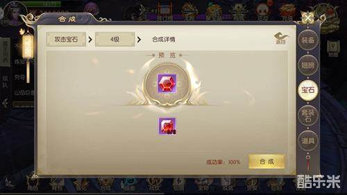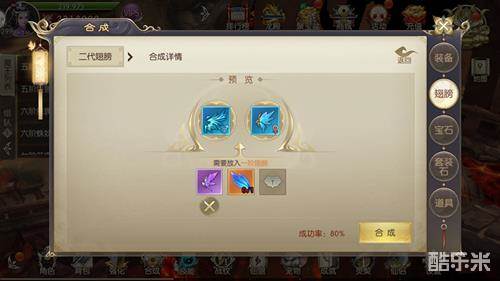 合成系统能够合成【装备】、【翅膀】、【宝石】、【套装石】、【道具】