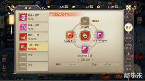 在装备上镶嵌宝石以提高属性,从四阶装备开始就拥有两个宝石孔,七阶以上装备拥有三个,VIP5以上还能获得额外的一个宝石孔。