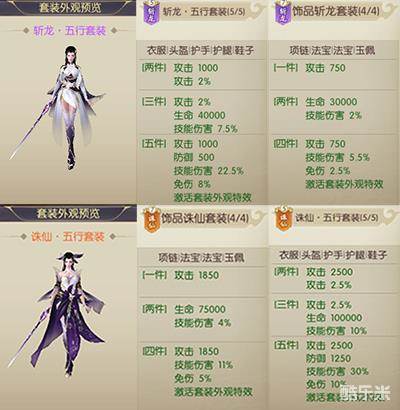一级的套装为【斩龙套装】,二级的为【诛仙套装】,防具和饰品各有一套。同一阶的装备合成出来才是同一套装哦。