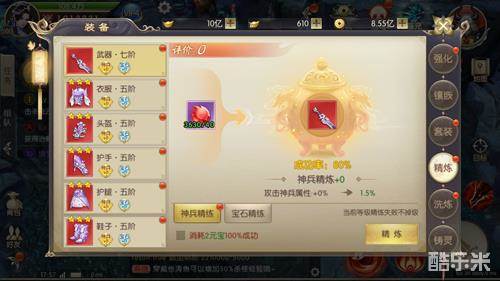 玩家370级解锁精炼,可使用【神兵精炼石】百分比提升神兵效果,或【宝石精炼石】百分比提升宝石效果。