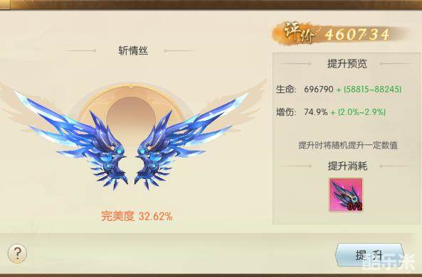 提升:多余的羽毛可用于提升翅膀资质,提高战力加成百分比。
