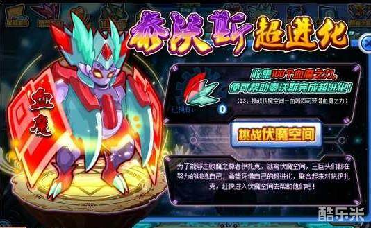 进入到泰沃斯超进化页面中,去伏魔空间——血魔,挑战里面的精灵可以收集血魔之力,100个血魔之力能帮助泰沃斯超进化成为泰沃西。