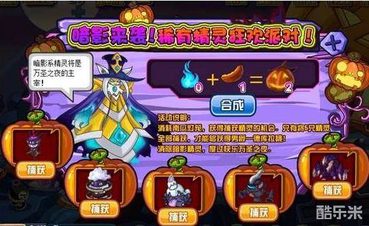 活动规则很简单,打败在南瓜山谷的飘飘和奥莱德,收集幽灵火和南瓜皮来合成南瓜灯。用南瓜灯开启下面5只精灵的挑战机会,每只精灵需要的南瓜灯数目不同。从左边开始第1、2、4精灵需要1个南瓜灯开启挑战,第3、5精灵需要2个南瓜灯开启挑战。而第五只精灵就是本周更新的格尔顿,当5只精灵全部达标后,就能得到德库拉精元了!