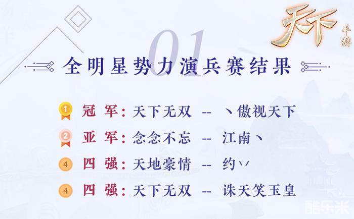 8月16日晚19点,《天下》手游全明星演兵争霸决赛现场热血沸腾,参赛势力摩拳擦掌、严阵以待,为势力荣誉而战!他们分别是——天地柔情的晓丶,天下无双的丶傲世天下,天地豪情的约丷,天长地久的夙愿,天长地久的此生乄唯一,天下无双的诛天笑玉皇,念念不忘的江南和君临天下的竹墨!其中天下无双的丶傲世天下成功从8支超强战队当中脱颖而出,成为本场全明星演兵争霸赛中最耀眼的启明星!同时也恭喜念念不忘的江南一路过五关斩六将、夺得亚军!