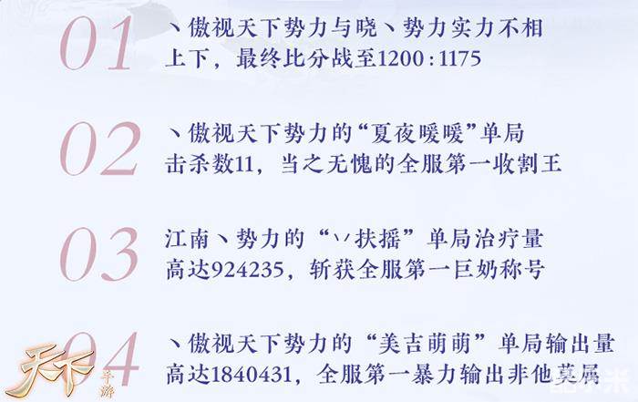在这次决赛八强第一战时,来自天地豪情的晓丶势力便与来自天下无双的丶傲视天下势力进行了一场巅峰对决。作为本届全明星跨服竞技赛王者阶段的冠军晓丶战队的势力,本是这次势力演兵冠亚军争夺的“重磅选手”,但因缘巧合却让这场旷世之战提前上演。比赛中战况焦灼,比分紧咬,最后战至1175:1200,丶傲视天下势力成功打破成王路上的第一层阻碍,提前给大家呈现了一场刺激精彩的“王者之争”。